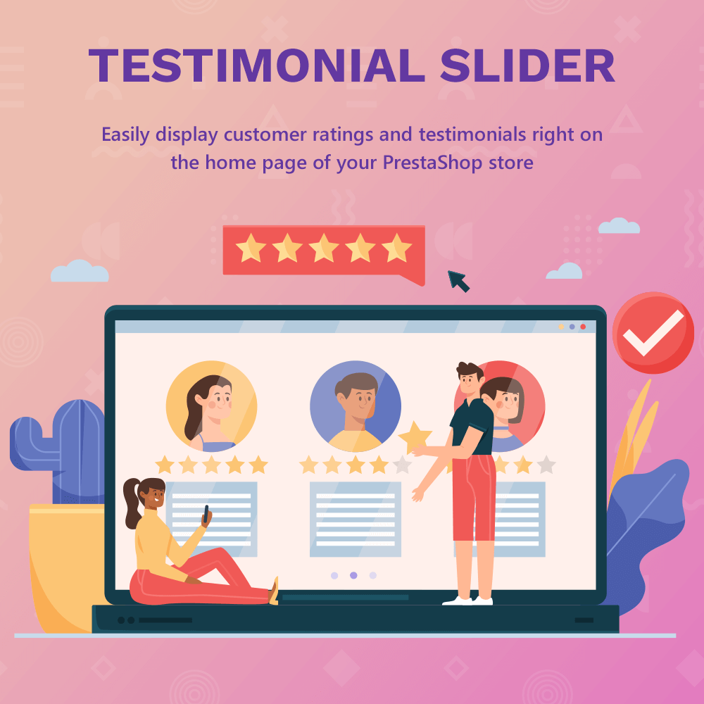 Easily display customer ratings and testimonials right on the home page of your PrestaShop store. A great way to build customer trust with authentic testimonials through a clean and customizable slider!