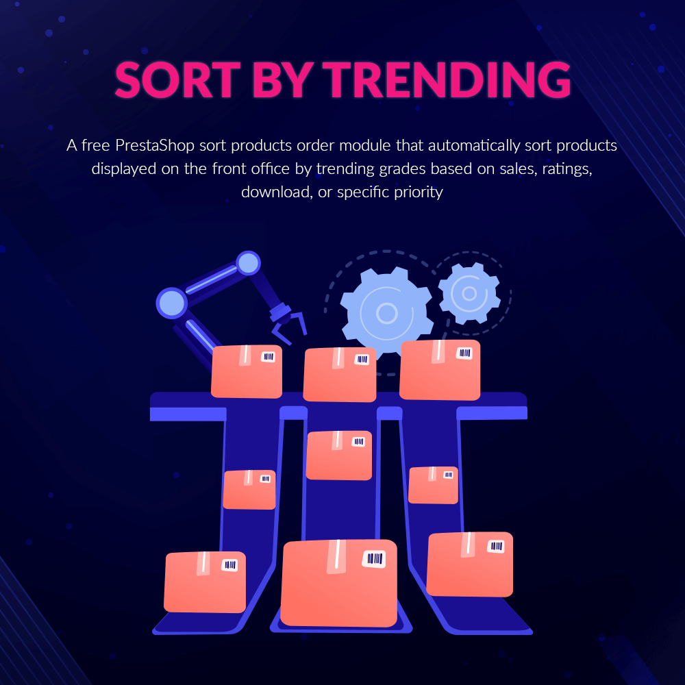 A free PrestaShop sort products order module that automatically sorts products displayed on the front office by trending grades based on sales, ratings, download, or specific priority.