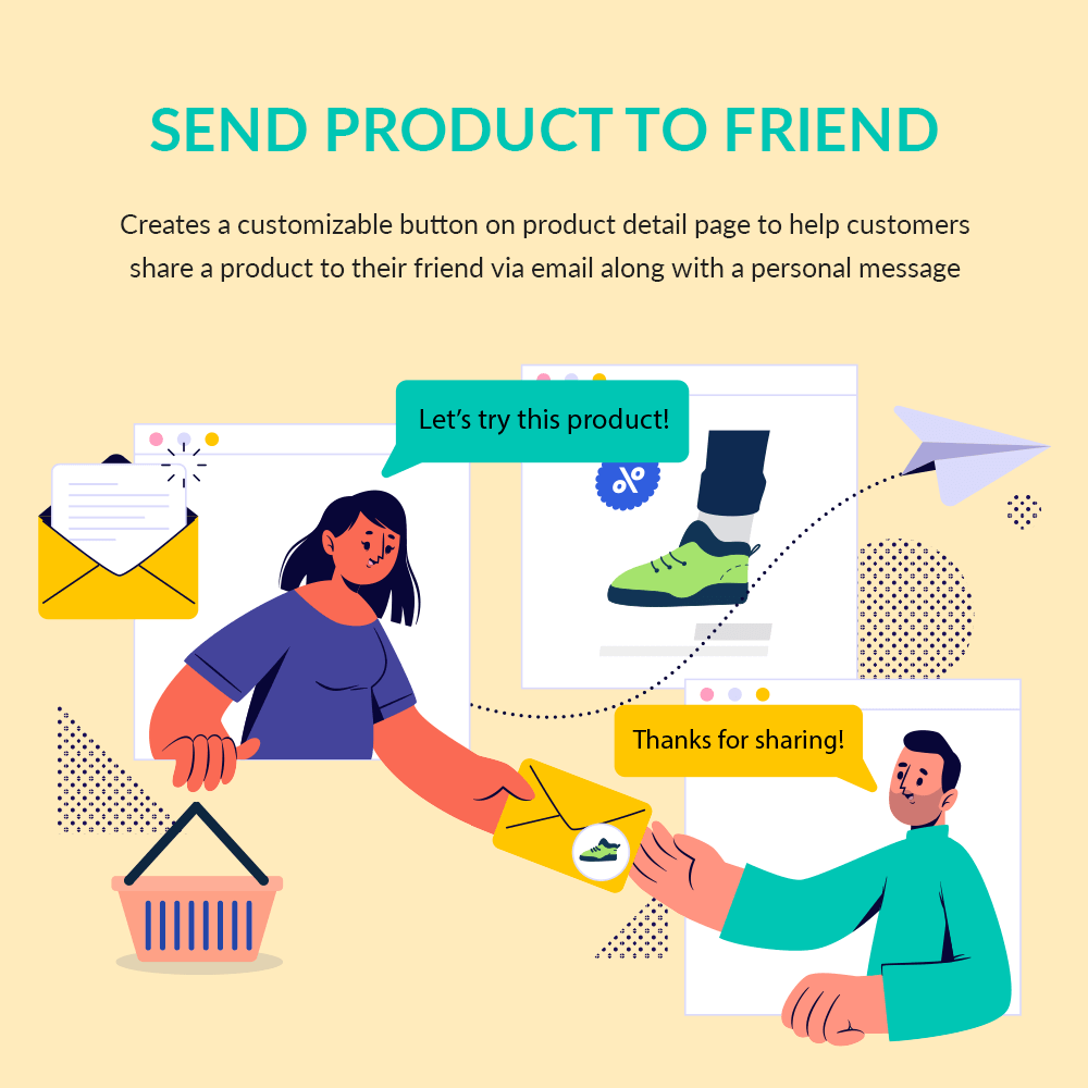 “Send product to friend” is a free PrestaShop send to a friend module that creates a customizable button on product detail page to help your customers conveniently share a product to their friend via email along with a personal message.